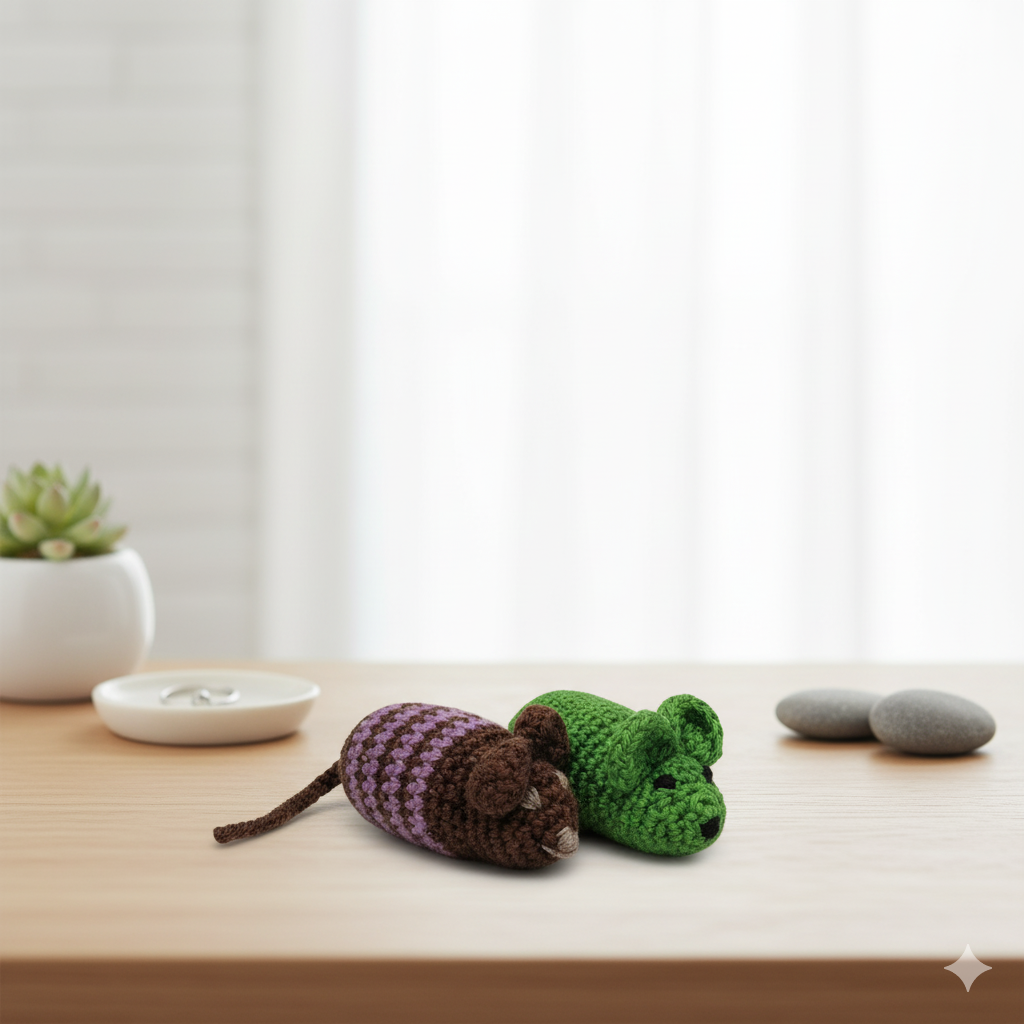 Vår virkade kattleksak i form av en mus är den perfekta lilla leksaken för din katt. Tillverkad av mjuk och slitstark bomullstråd, är denna lilla mus både säker och rolig att leka med. Dess kattmyntafyllning ger extra stimulans och uppmuntrar din katt att leka och jaga, hjälper till att hålla dem underhållna under timmar av lek. Dess lilla storlek och lätta vikt gör den perfekt för att din katt ska kunna slänga runt och leka med den. Perfekt för kattägare som vill öka sin katts lekfullhet samtidigt som de ger dem en trygg och säker leksak att njuta av.
